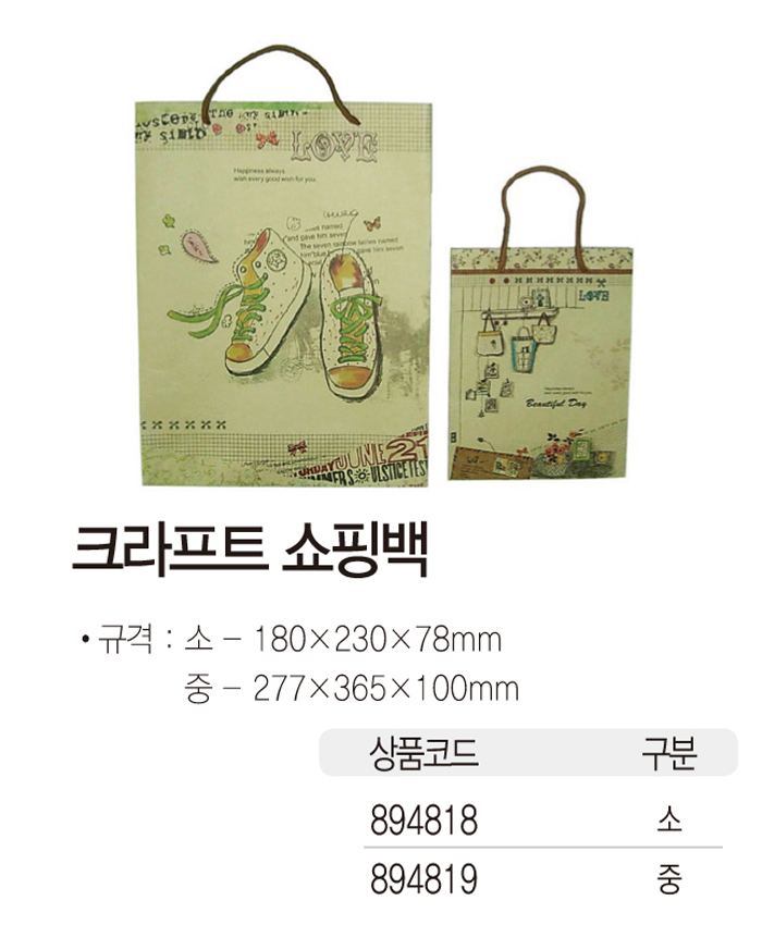 * 제조사 :해동글로벌 * 원산지 :중국 * 원펄프 느낌이 그대로 있으며 귀여운 디자인이있어 여러용도에 사용가능 ■ 품명 및 모델명: 크라프트쇼핑백(소/180*230*78) ■ 법에 의한 인증, 허가 등을 받았음을 확인할 수 있는 경우 그에 대한 사항: 해당없음 ■ 제조국 또는 원산지: 중국 ■ 수입여부: 수입 ■ 안전인증여부: N