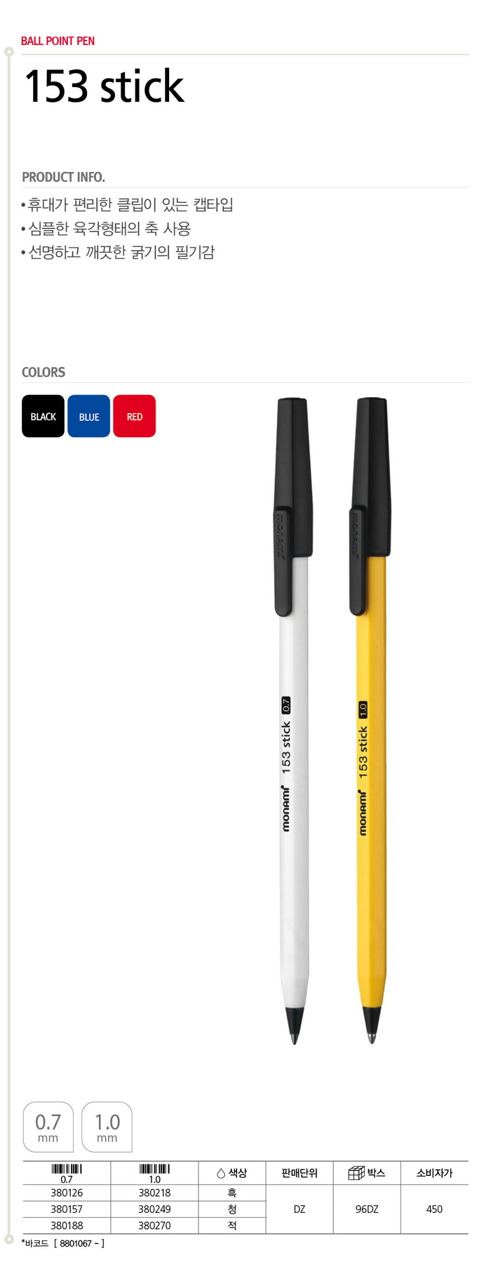 * 제조사 :모나미 * 원산지 :대한민국 캡식의 사무용 유성볼펜 깔끔한 육각 디자인 모나미 153 시리즈의 신제품 ■ 품명 및 모델명: 153 Stick 볼펜(청/0.7/12자루/모나미) ■ 법에 의한 인증, 허가 등을 받았음을 확인할 수 있는 경우 그에 대한 사항: 해당없음 ■ 제조국 또는 원산지: 대한민국 ■ 수입여부: 해당없음 ■ 안전인증여부: N