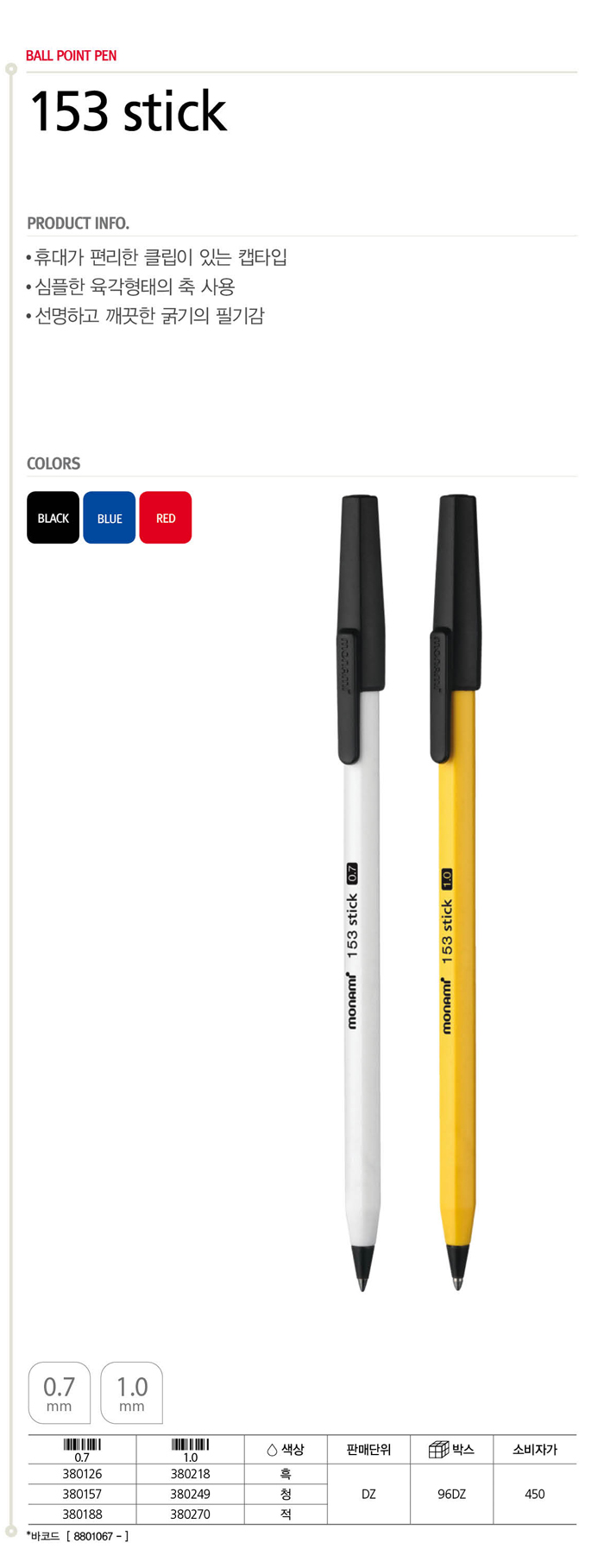 * 제조사 :모나미 * 원산지 :대한민국 캡식의 사무용 유성볼펜 깔끔한 육각 디자인 모나미 153 시리즈의 신제품