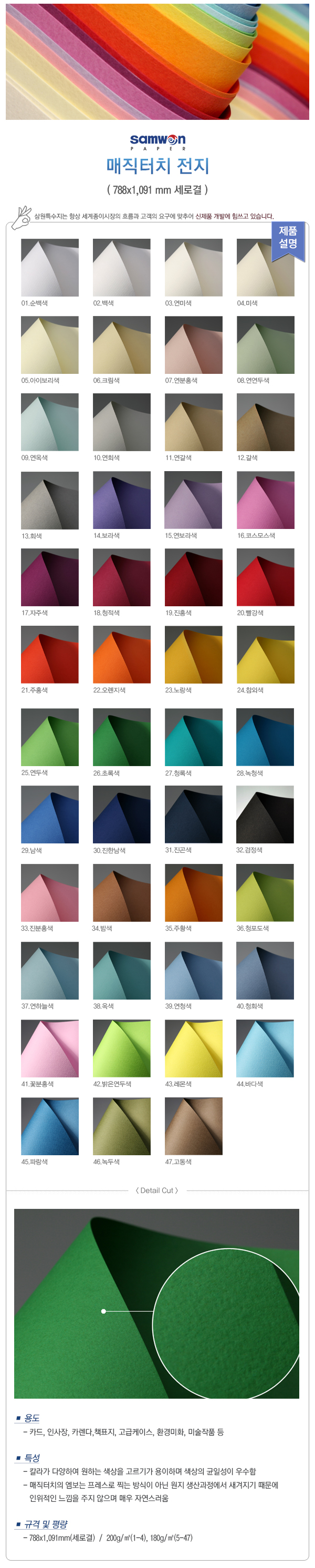 또한 매직터치으이 엠보는 프레스로 찍는 방식이 아닌 원지 생산과정에서 새겨지기 때문에 인위적인 느낌을 주지 않으며 매우 자연스럽습니다.
