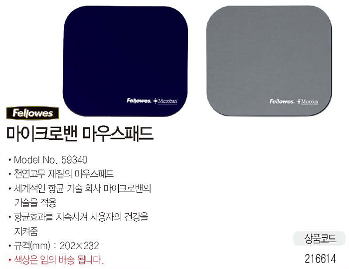 ■품명 및 모델명:마이크로벤 마우스패드(59340/펠로우즈) ■ 제조국또는 원산지:중국 ■법에의한 인증,허가등을 받았음을 확인할수 있는 경우 그에대한 사항:해당없음 ■KCC인증대상 여부:N ■정격전압,소비전력 에너지소비효율등급:N ■수입여부:㈜펠로우즈코리아 ■ 안전인증여부:N