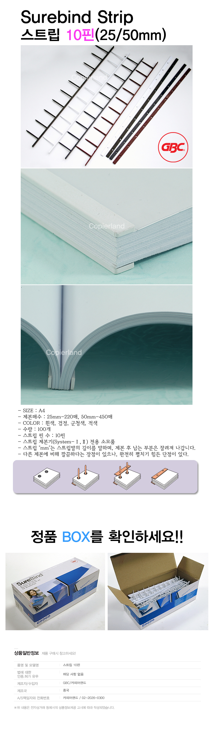 * 규격 : 10핀/ 25 mm 포장단위 : 100매 ■ 품명 및 모델명: 벨로바인딩 스트립A4(25mm/10핀/흑색) ■ 법에 의한 인증, 허가 등을 받았음을 확인할 수 있는 경우 그에 대한 사항: 해당없음 ■ 제조국 또는 원산지: 중국 ■ 수입여부: 카피어랜드㈜ ■ 안전인증여부: 해당없음