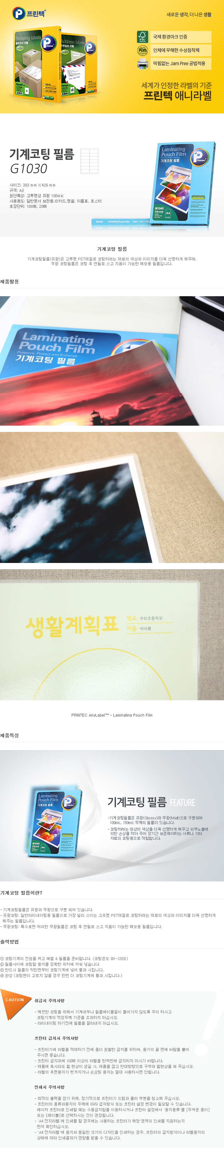 코팅필름(G1030/A3/303*426/100mic/20매/프린텍)/권