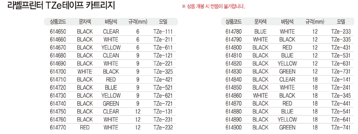 * 브라더 라벨 프린터와 호환되는 테이프 카트리지 ■ 품명 및 모델명: 테이프카트리지(TZ-441/18mm) ■ 법에 의한 인증, 허가 등을 받았음을 확인할 수 있는 경우 그에 대한 사항: 해당없음 ■ 제조국 또는 원산지: 중국 ■ 수입여부: BROTHER ■ 안전인증여부: N