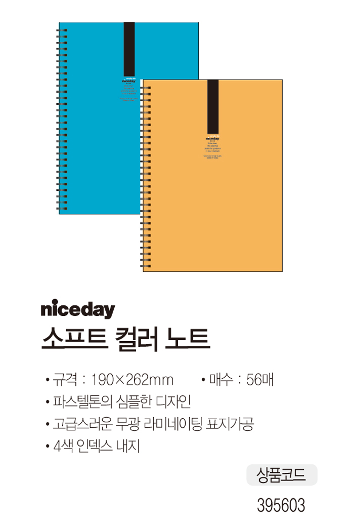* 규격 : 190*262mm *매수 : 56매 * 파스텔톤의 심플한 디자인 * 고급스러운 무광 라미네이팅 표지가공 * 4색 인덱스 내지 ■ 품명 및 모델명: 소프트컬러노트 ■ 법에 의한 인증, 허가 등을 받았음을 확인할 수 있는 경우 그에 대한 사항: 해당없음 ■ 제조국 또는 원산지: 국산 ■ 수입여부: 해당없음 ■ 안전인증여부: 해당없음
