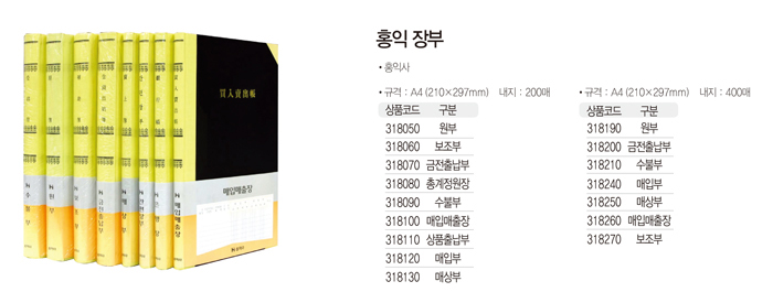 * 구분을 색상란에서 선택하시기 바랍니다.특징- 구분 : 금전, 원부, 보조, 총계, 상품, 매매, 매상, 매입, 어음, 간편장부- 400Page ■ 품명 및 모델명: 장부A4(400P/매매/홍익사) ■ 법에 의한 인증, 허가 등을 받았음을 확인할 수 있는 경우 그에 대한 사항: 해당없음 ■ 제조국 또는 원산지: 국산 ■ 수입여부: 해당없음 ■ 안전인증여부: 해당없음
