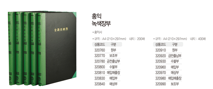 홍익 녹색장부(400P/매매) ■ 품명 및 모델명: 홍익 녹색장부(400P/매매) ■ 법에 의한 인증, 허가 등을 받았음을 확인할 수 있는 경우 그에 대한 사항: 해당없음 ■ 제조국 또는 원산지: 국산 ■ 수입여부: 해당없음 ■ 안전인증여부: 해당없음