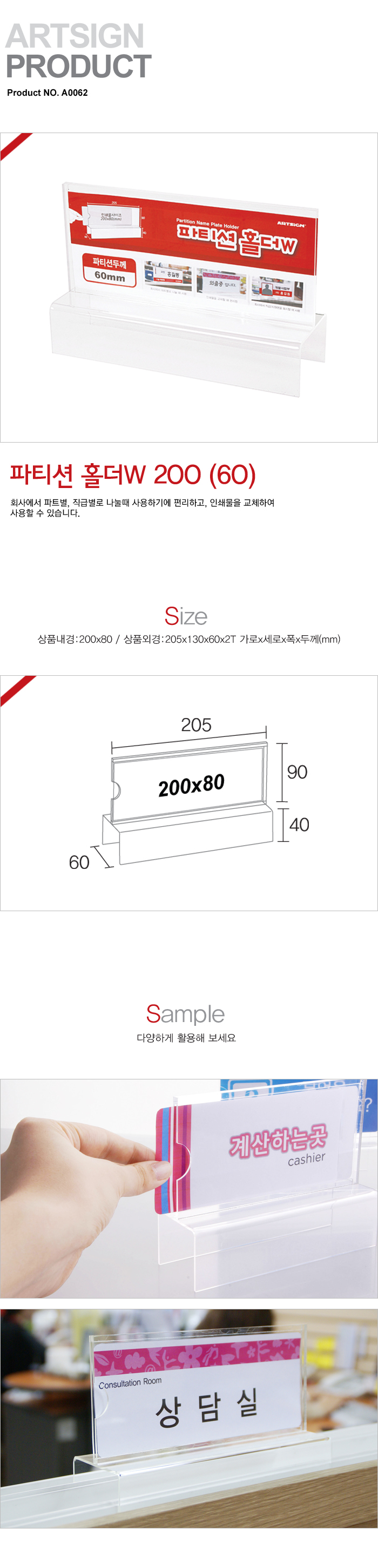 *제품설명 규격(mm) : 205*130*60*2T 속지크기 : 200*80 파티션을 사용하는 곳에서 부서명, 사원명 등을 표시하는데 사용됩니다 *법에의한 인증,허가등을 받았음을 확인할수 있는 경우 그에대한 사항 - 해당없음 *제조국또는 원산지 - 중국 *수입여부 - ㈜아트사인 *안전인증여부 - N