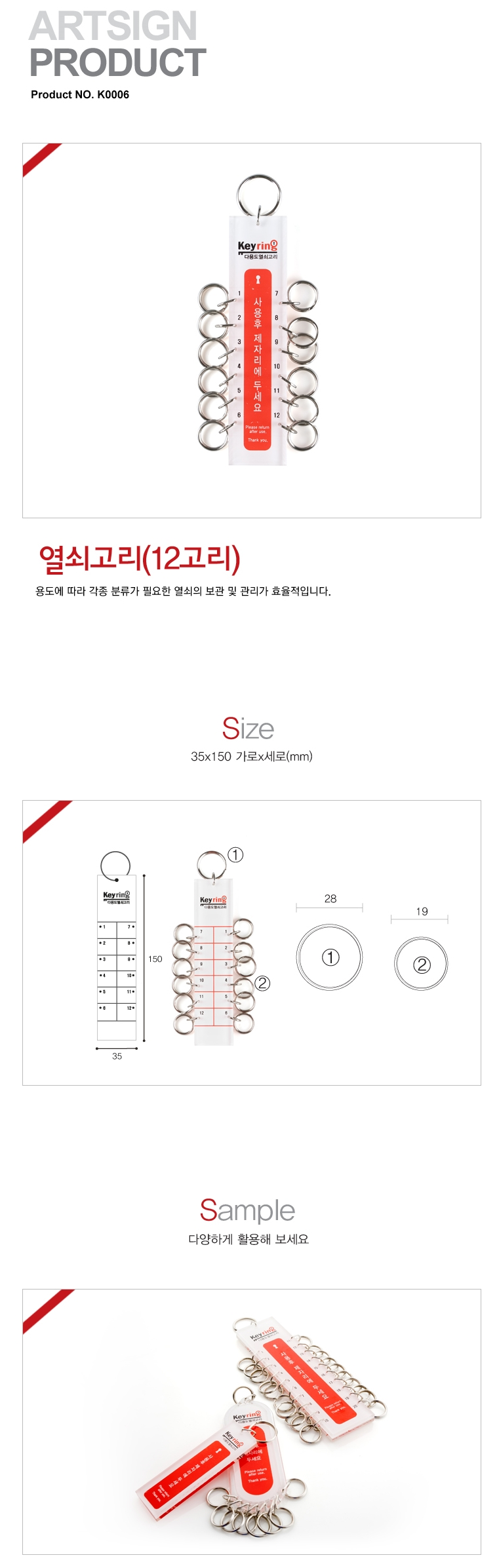 *제품설명 규격(mm) : 35*150 고리지름 : 19mm 용도에 따라 각종 분류가 필요한 열쇠의 보관 및 관리가 효율적입니다