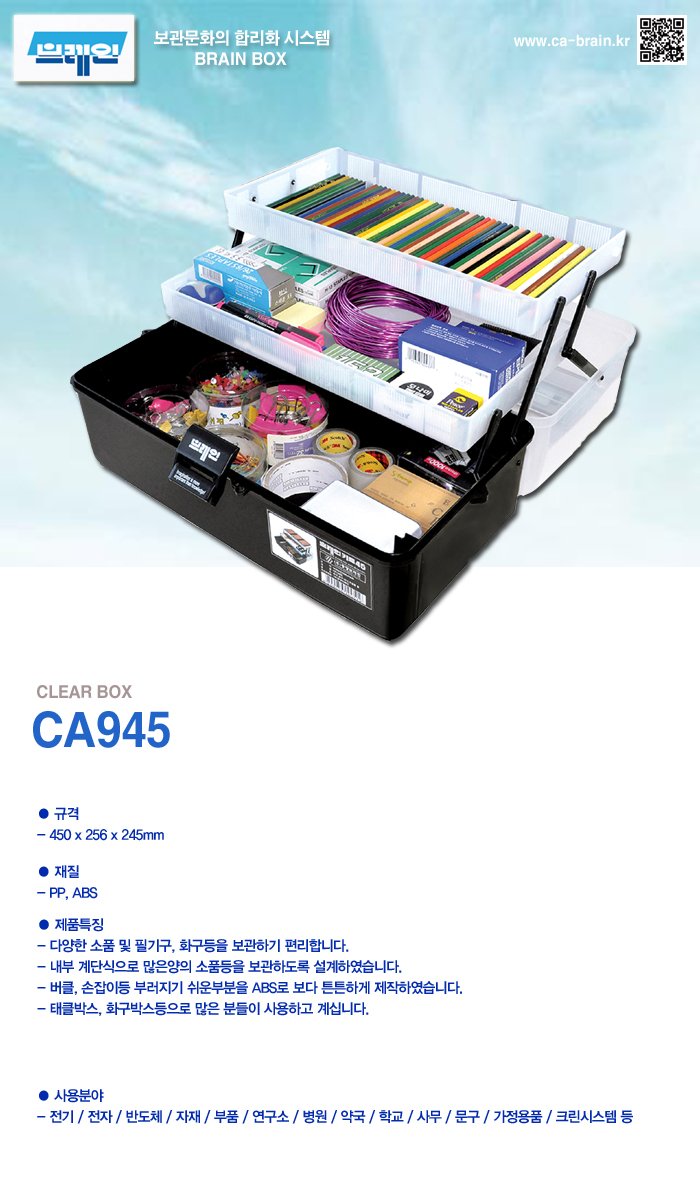 * 제조사 :브레인 * 원산지 :대한민국 * 규격(mm) : 450X256X245 * 문구, 화방용품, 의약품, 공구 등 다양한 제품의 보관에 용이 ■ 품명 및 모델명: 다용도함(CA945) ■ 법에 의한 인증, 허가 등을 받았음을 확인할 수 있는 경우 그에 대한 사항: 해당없음 ■ 제조국 또는 원산지: 대한민국 ■ 수입여부: 해당없음 ■ 안전인증여부: 해당없음