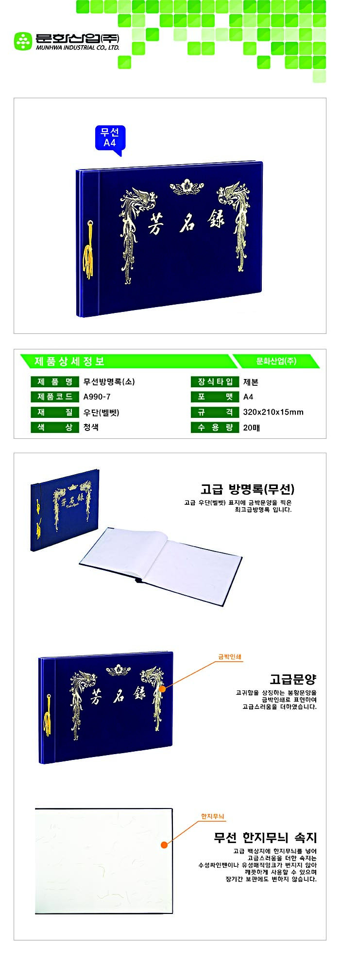 ■ 품명 및 모델명: 방명록(A4/무선/한지/A991-7/문화산업)