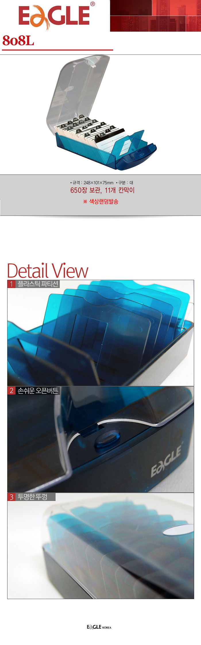 *상품 상세설명 제조사 : Eagle 규격(mm) : 248*101*75 650장 보관, 11개 칸막이 원터치로 자동열림 보관이 편리한 칸막이와 인덱스 *상품정보고시 *상품명 - ⓢ명함통(650장/808L) *품명및모델명 - 명함통 *법에의한 인증,허가등을 받았음을 확인할수 있는 경우 그에대한 사항 - 해당없음 *제조국또는 원산지 - 중국 *수입여부 - 해당없음