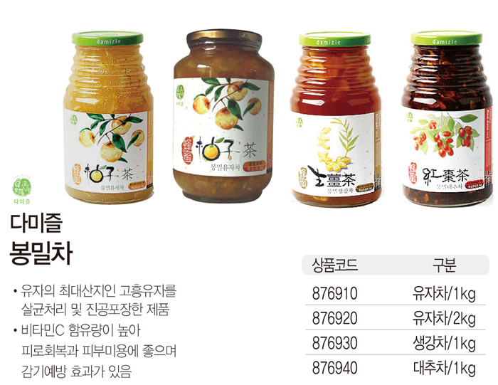 *상품정보고시 *상품명 - 봉밀생강차(1kg/다정) *식품의유형 - 액상차 *생산자 및 소재지 수입여부 - 제조원:㈜다정 소재지:경기도 포천시 영중면 영일로97번길28 *제조연월일(유통기한) - 유통기한:제조일로부터 2년까지 *용량(중량), 수량 - 1kg