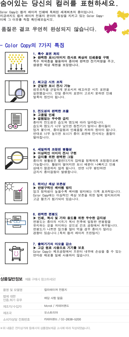 -상품정보고시*품명및모델명 - 컬러레이저용지A4 (120g/250매/NEUSIEDLER)*법에의한 인증 - 해당없음*제조국or 원산지 - 오스트리아*수입여부 - 카피어랜드㈜*안전인증여부 - 해당없음