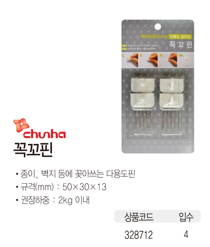 종이, 벽지 등에 꽂아 쓰는 다용도 핀 규격(mm) : 50*30*13 권장하중 : 2kg 이내