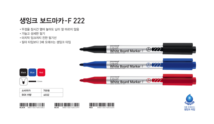-상품정보고시 *품명및모델명 - 생잉크 보드마카 F 222(청/1.3/1자루/모나미) *법에의한 인증 - KC인증 B441R390-7001A *제조국or 원산지 - 태국 *수입여부 - (주)모나미 *안전인증여부 - B441R390-7001A