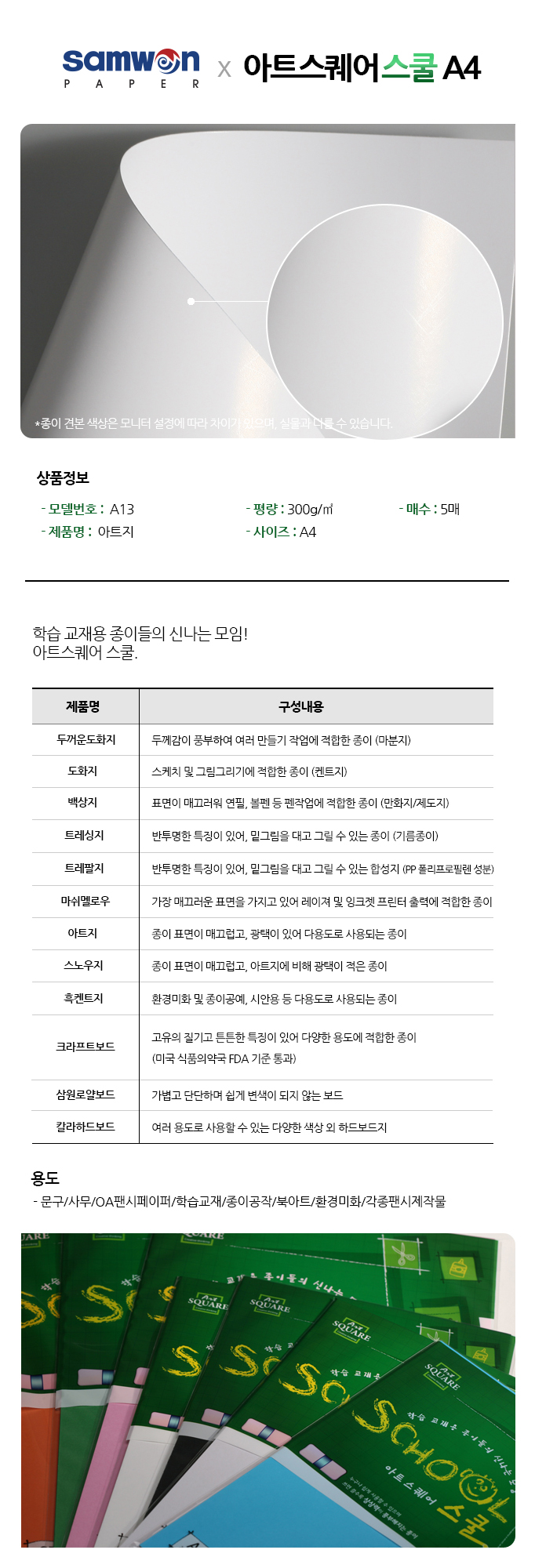 ■ 품명 및 모델명: 아트스퀘어 스쿨(A13/아트지/A4/300g/5매/삼원)