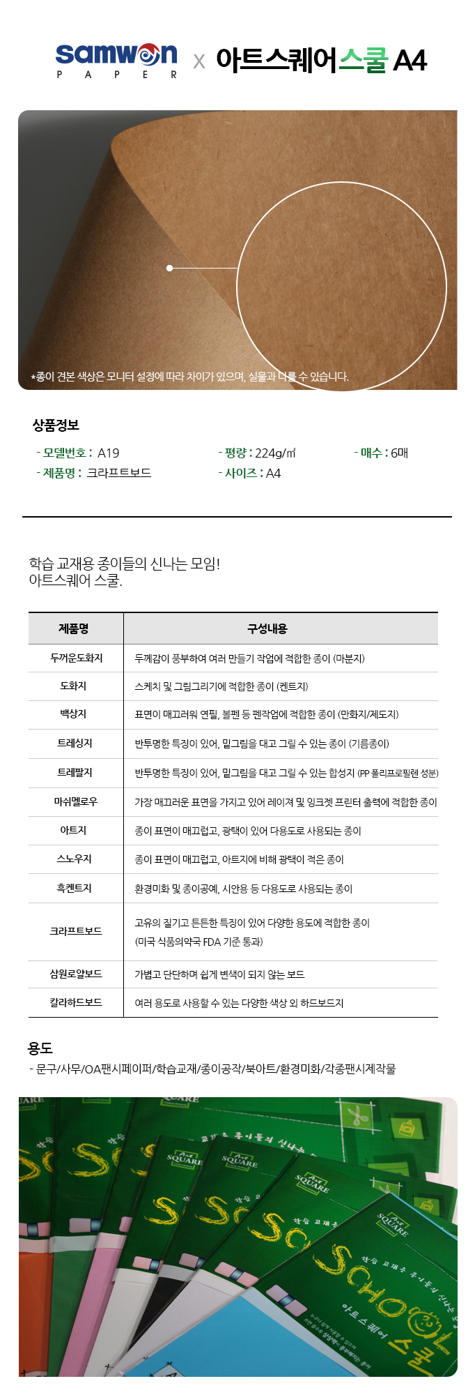 ■ 품명 및 모델명: 아트스퀘어 스쿨(A19/크라프트보드/A4/224g/6매/삼원)