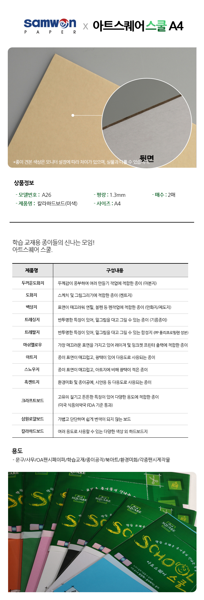 ■ 품명 및 모델명: 아트스퀘어 스쿨(A26/미색/칼라하드보드/A4/2매/삼원)