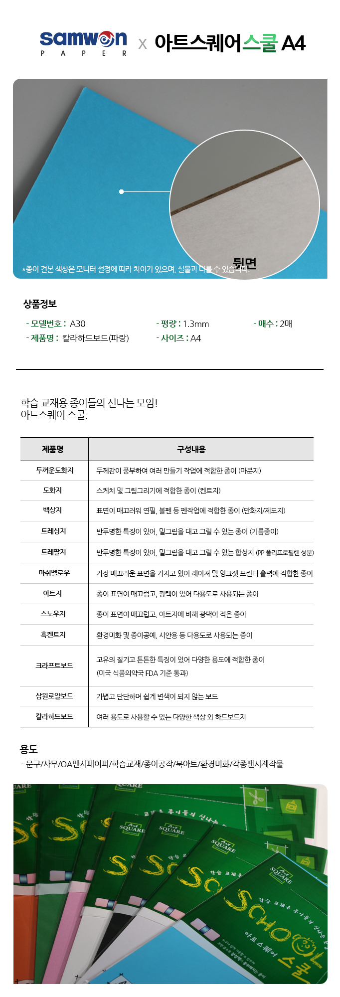 ■ 품명 및 모델명: 아트스퀘어 스쿨(A30/파랑/칼라하드보드/A4/2매/삼원)