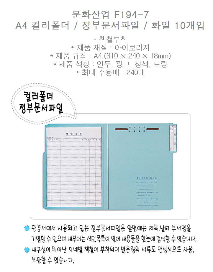 친환경 컬러정부화일(10개팩/청색/F194-7/문화산업)/팩/청색