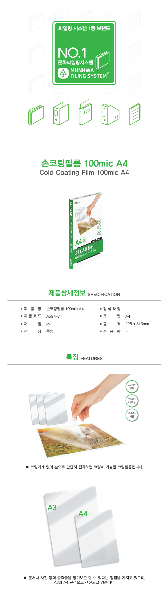 손코팅필름(A4/100mic/A597-7/문화산업)/권
