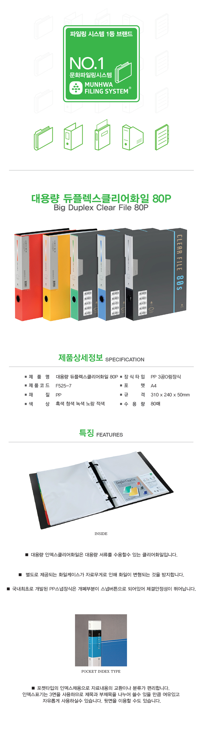 인덱스 클리어 화일(80매/청색/F525-7/문화산업)/개