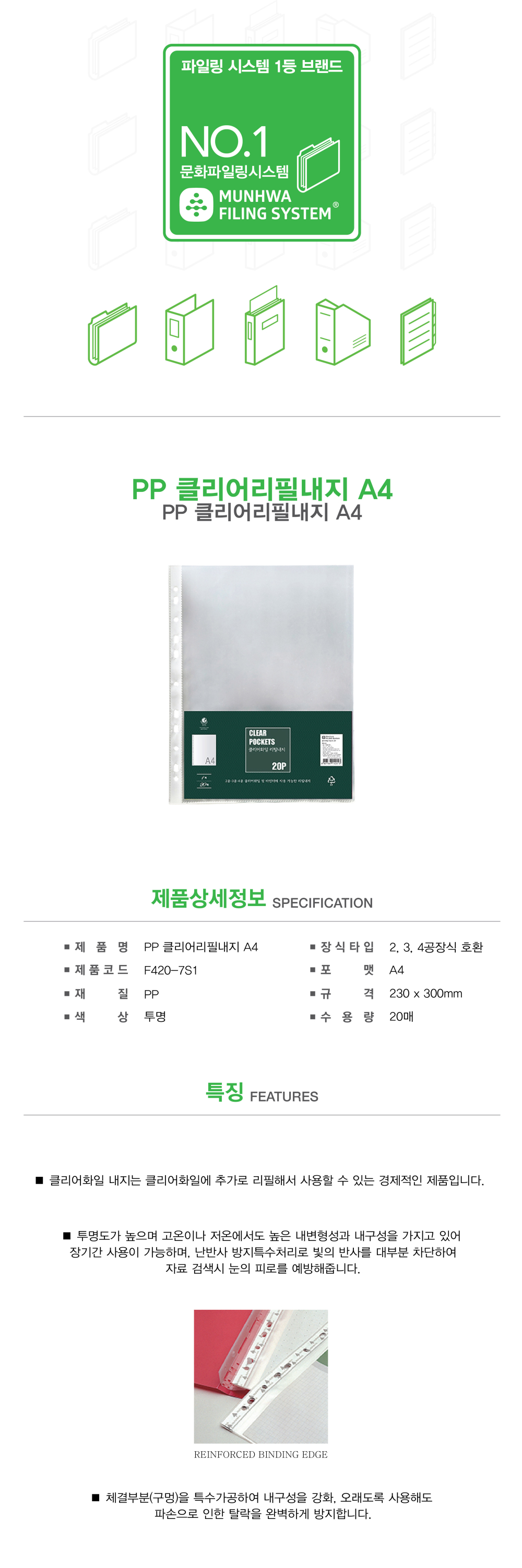 클리어화일내지(A4/20매/F420-7S1/문화산업)/팩