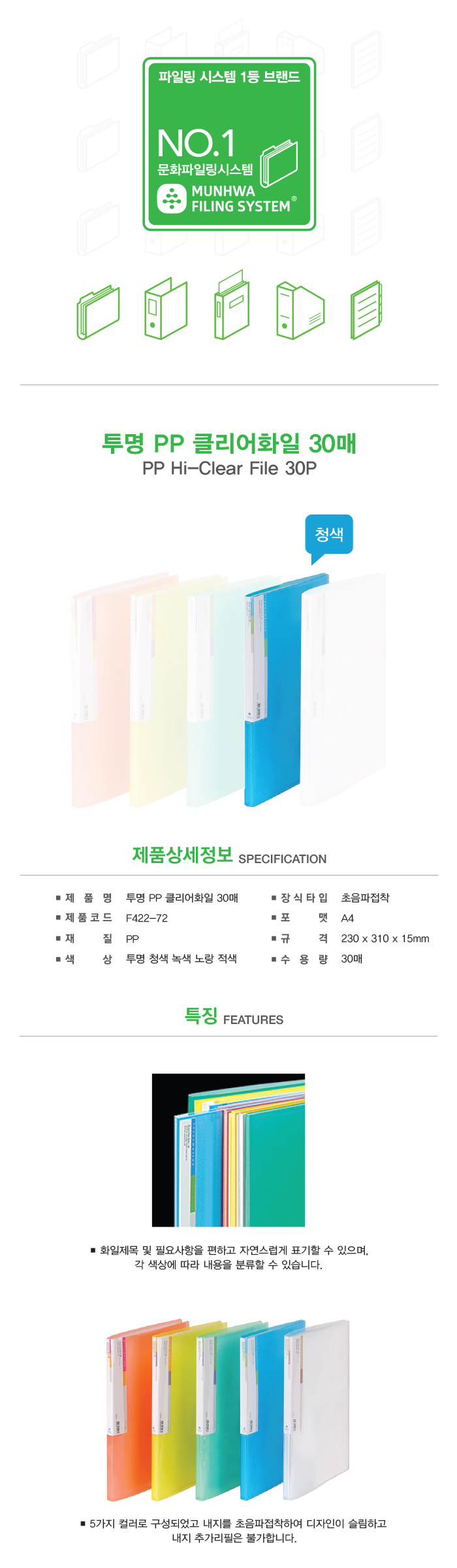 ■ 품명 및 모델명 : 투명PP클리어화일(30매/청색/F422-7/문화산업)