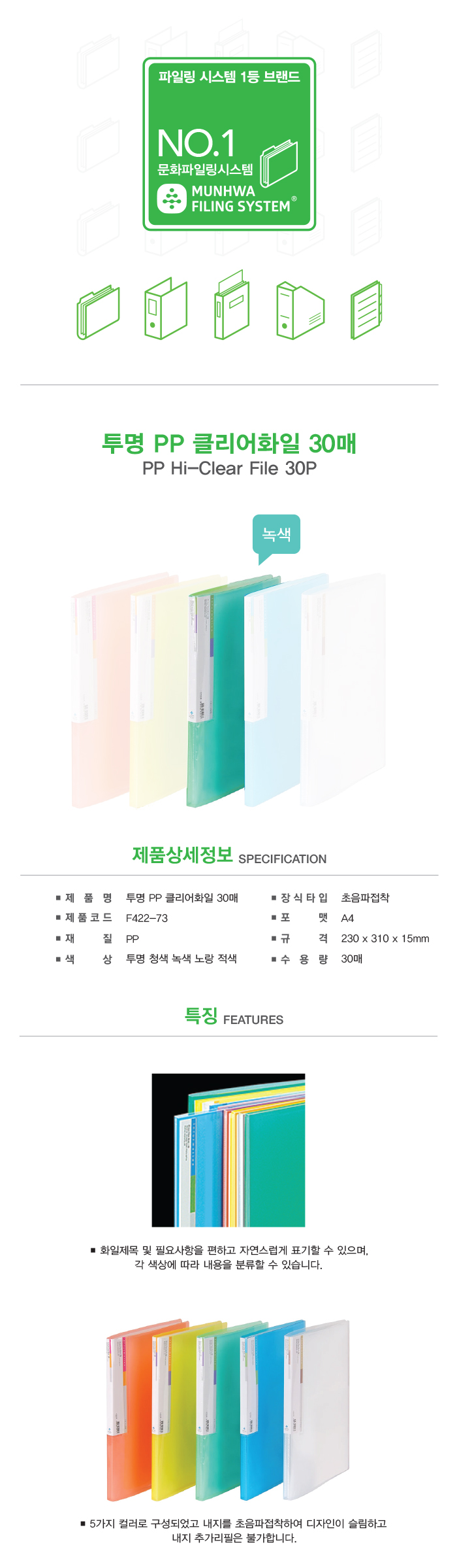 ■ 품명 및 모델명 : 투명PP클리어화일(30매/녹색/F422-7/문화산업)