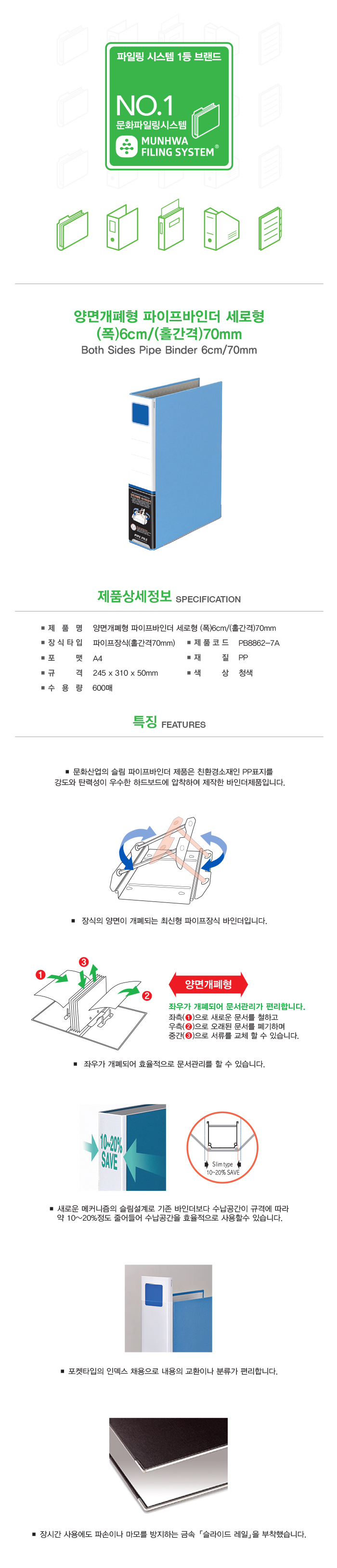 양면개폐형 파이프바인더(세로형/PB8862-7A/6cm*70mm/청색/문화산업)/개