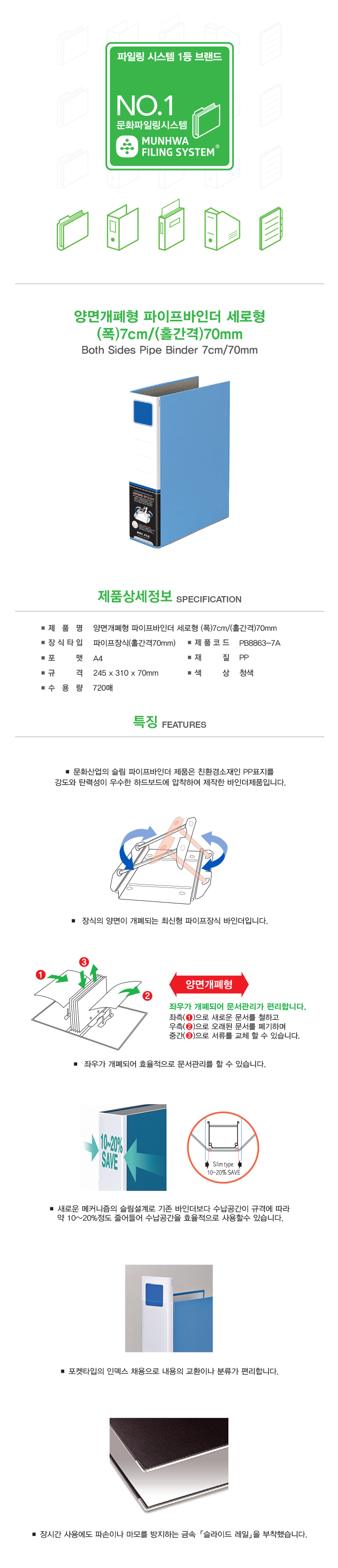 양면개폐형 파이프바인더(세로형/PB8863-7A/7cm*70mm/청색/문화산업)/개