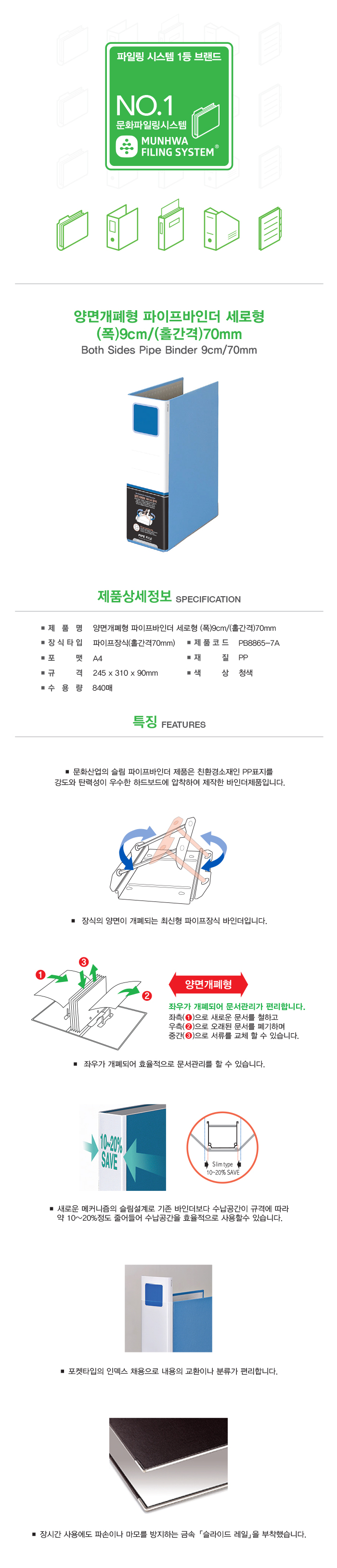양면개폐형 파이프바인더(세로형/PB8865-7A/9cm*70mm/청색/문화산업)/개
