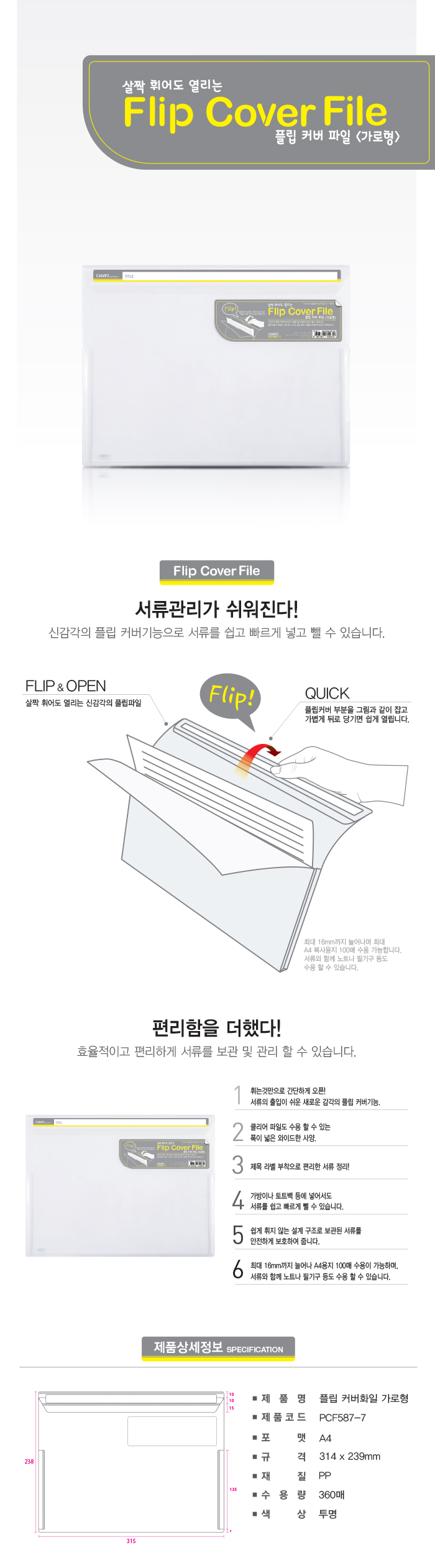 ■ 품명 및 모델명: 플립 커버화일 가로형(A4/PCF587-71/투명/캠프투)