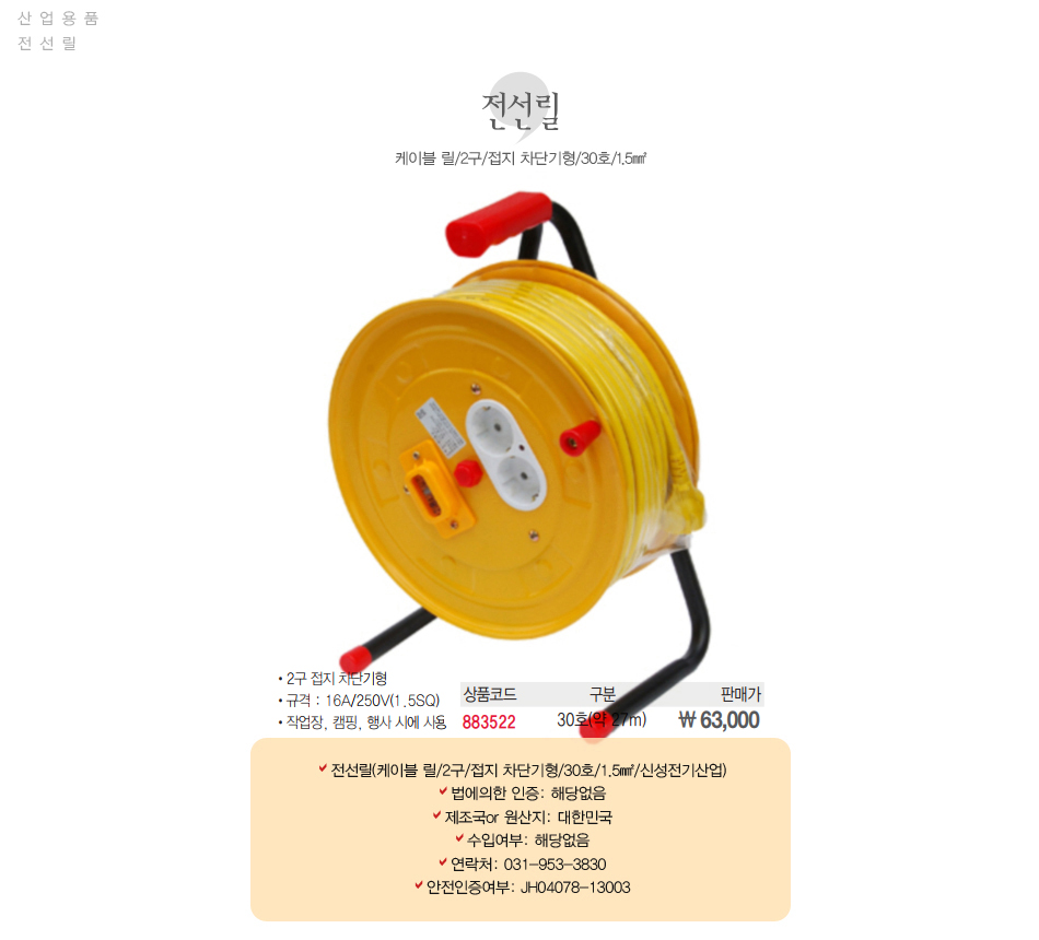[업체별도배송]전선릴(케이블 릴/2구/접지 차단기형/30호/27M*1.5㎟/신성전기산업)/개