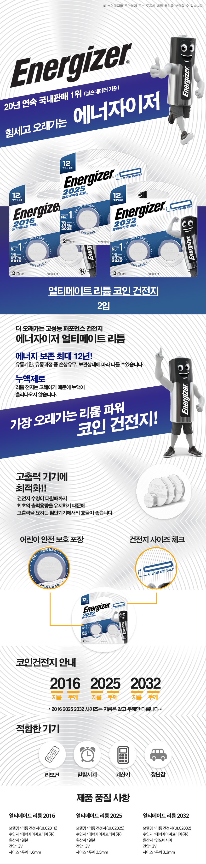 ■ 품명 및 모델명 : 에너자이저 얼티메이트 리튬 코인 건전지(2025/2입)
