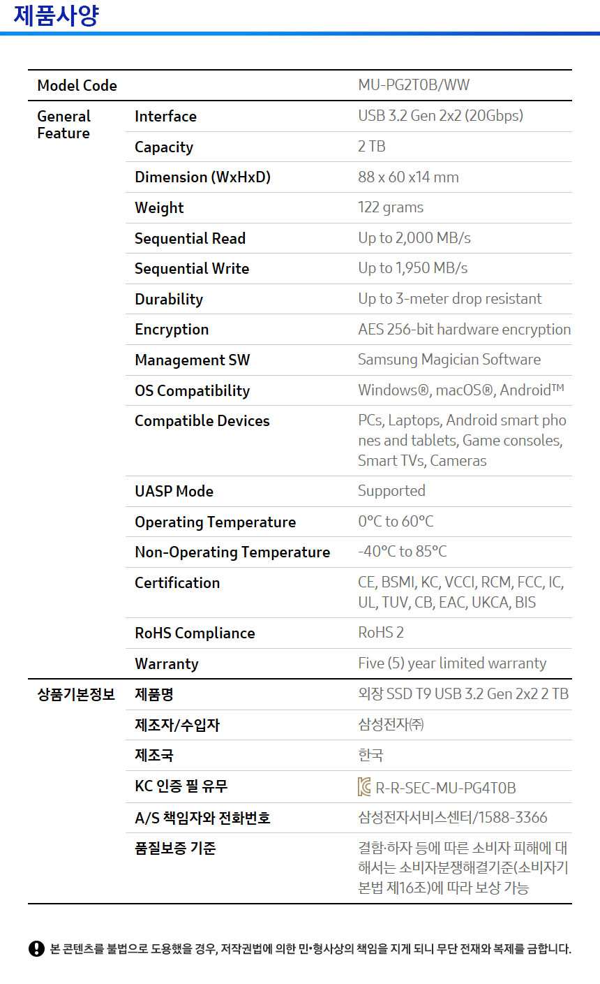 ■ 주요사양 : 인터페이스(USB 3.2 Gen2X2(20Gbps)), 속도(읽기 2.000MB/s,쓰기 1,950MB/s), 무게 122g, 국제안전표준 IEC 62368-1 준수, 다양한 디바이스와 호환(PC,안드로이드,MAC,콘솔게임), 세계 최고의 플래시 메모리(삼성메모리사용), 최적화된 관리 소프트웨어(삼성 Magician 소프트웨어 사용)