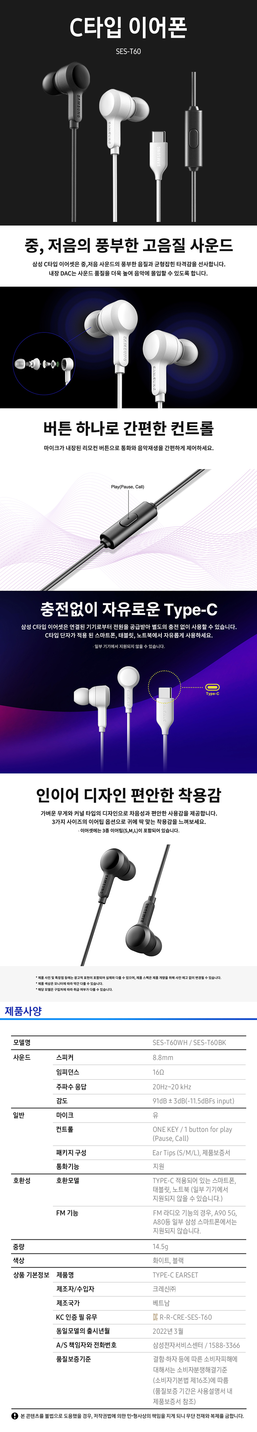 C타입 이어폰(SES-T60BK/블랙/삼성)/개