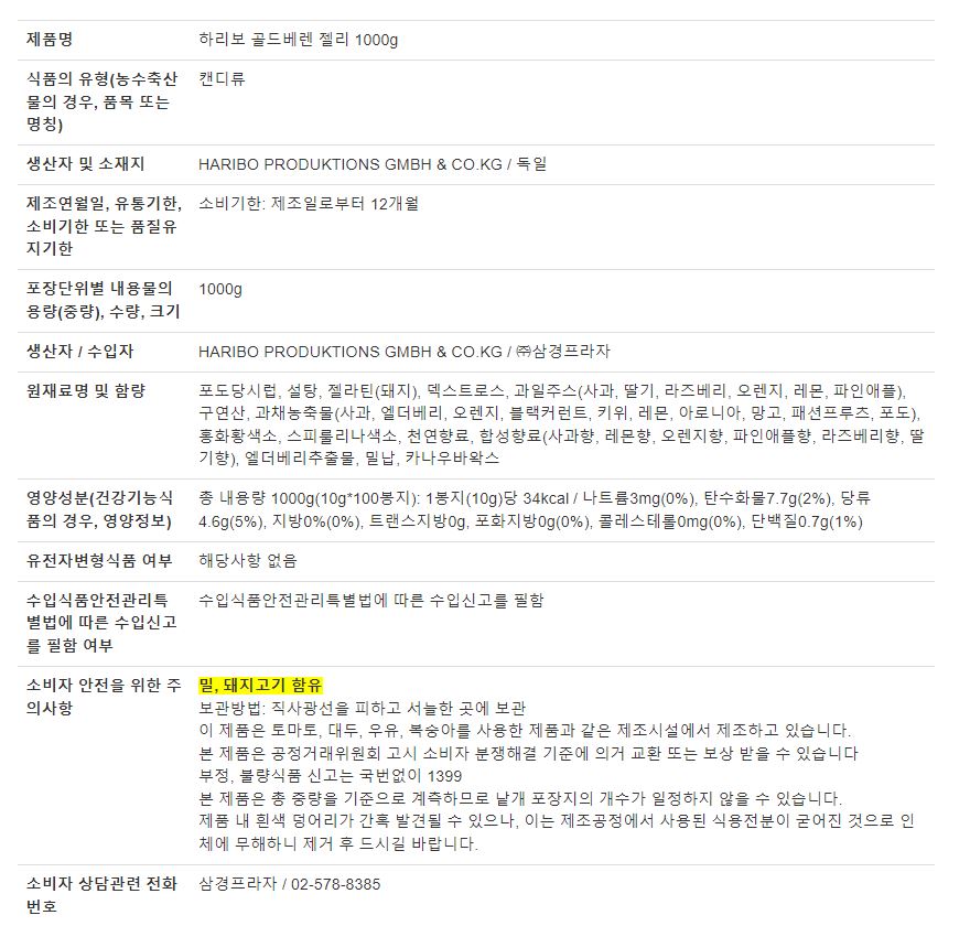 ■ 품명 및 모델명 : 하리보 골드베렌(1kg/하리보)
