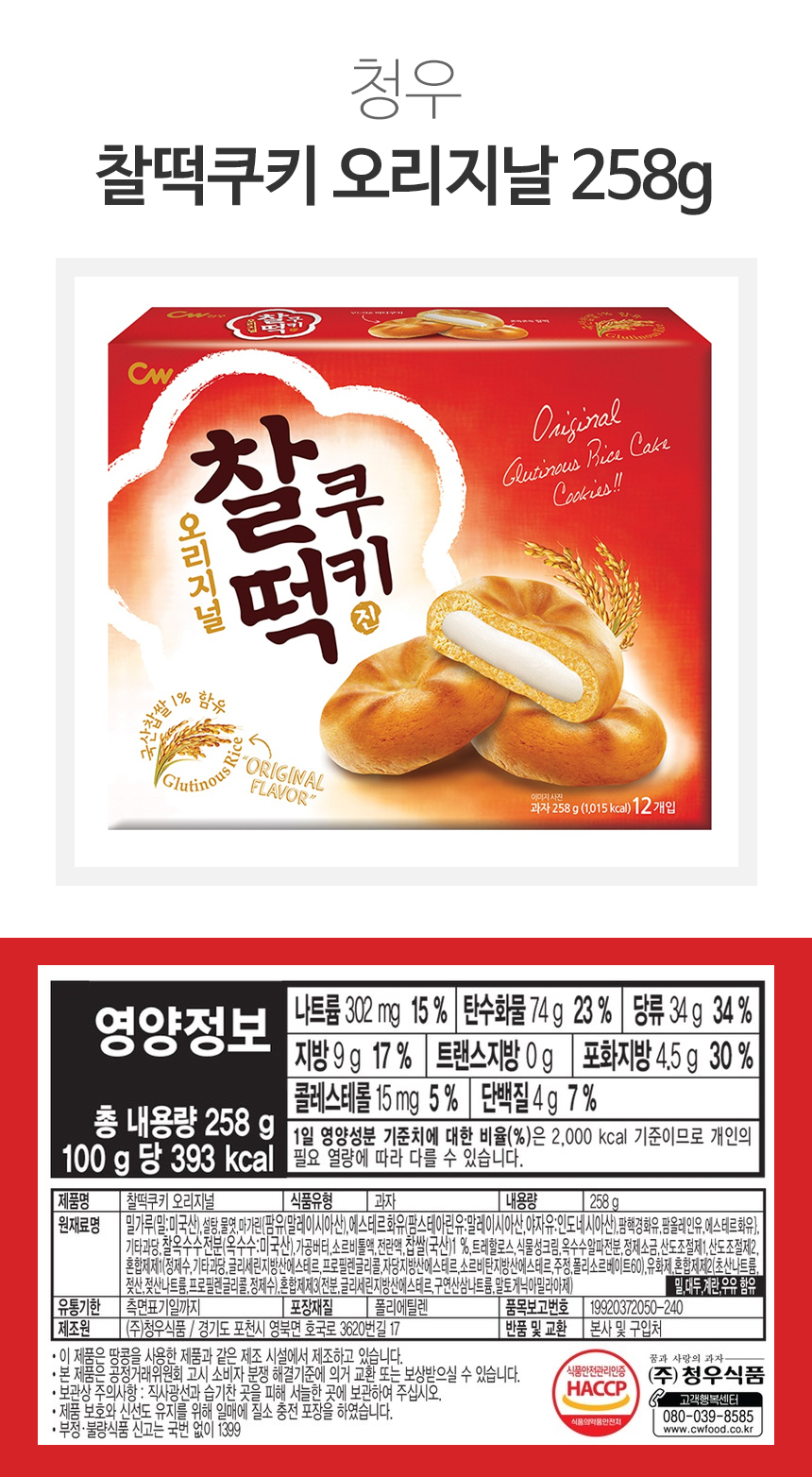■ 품명 및 모델명 : 찰떡쿠키 오리지날(258g/청우)