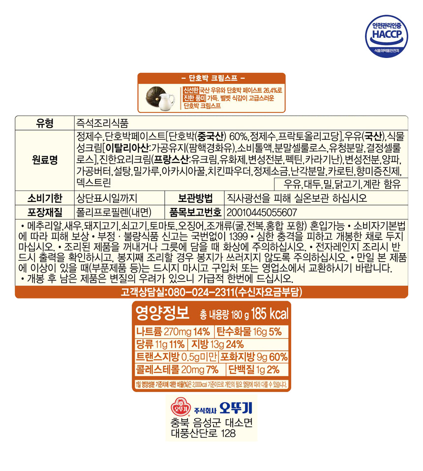 ■ 품명 및 모델명 : 단호박크림스프(상온/180g파우치/오뚜기)