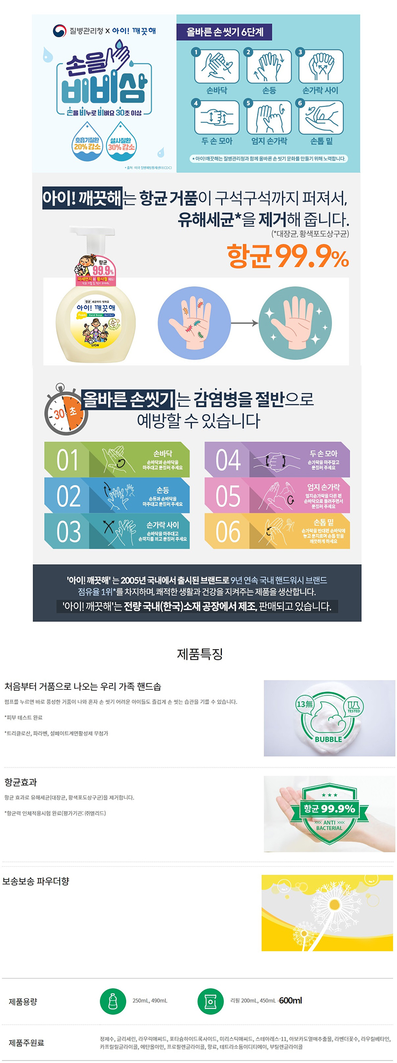 ■ 품명 및 모델명 : 아이깨끗해 핸드워시 대용량 리필(파우더순/600ml/라이온코리아)