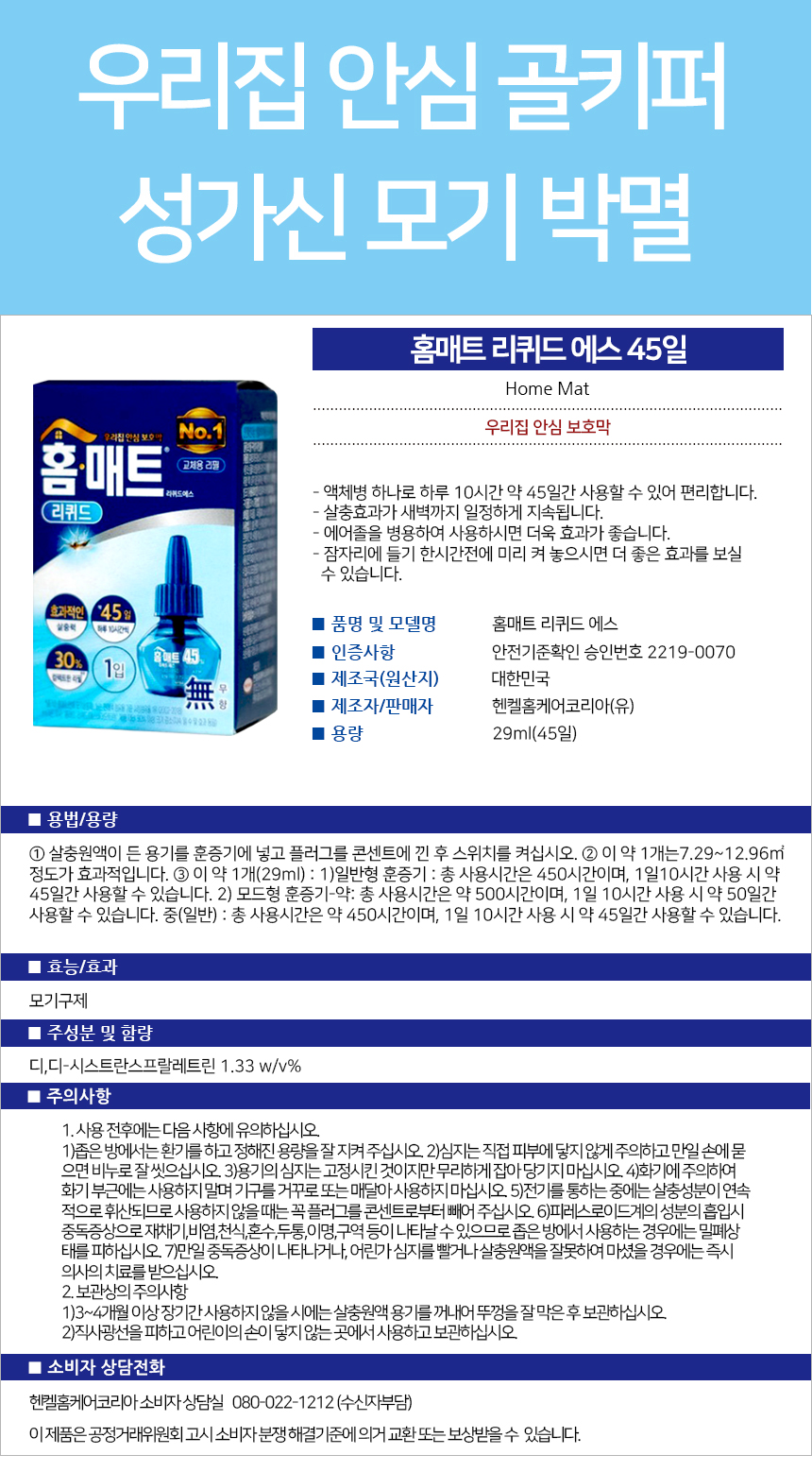 ■ 품명 및 모델명 : 홈매트 훈증기 리퀴드 리필 45일*1입(코드형/플러그형)