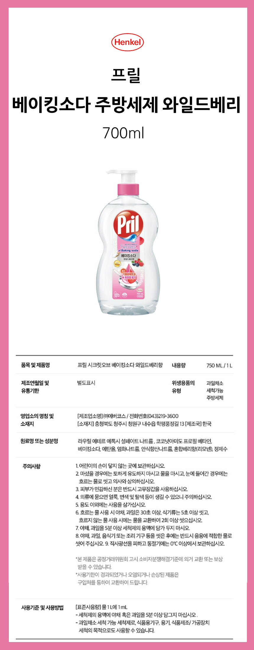 ?■품명 및 모델명 : 프릴 베이킹소다 주방세제(700ml/와일드베리향)■법에 의한 인증 : 해당없음