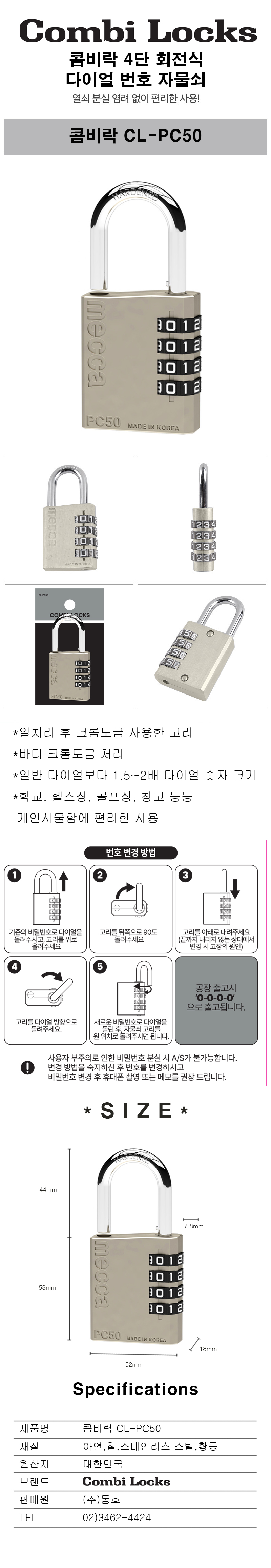 ■ 품명및모델명 : 콤비락 자물쇠(CL-PC50/4단/회전식/다이얼)