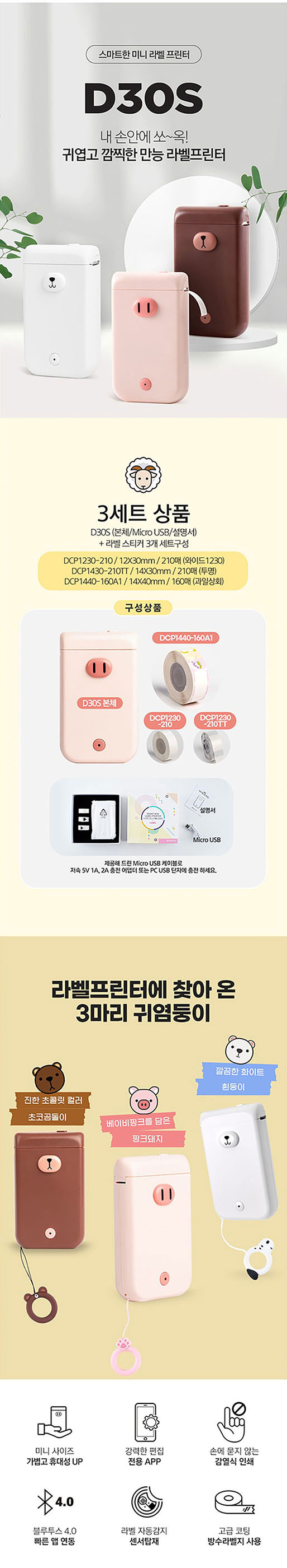 ■ 주요사양 : 구성(라벨프린터 DS30S+라벨프리트지 3SET)소프트웨어(IOS, Android앱지원)해상도(203dpi)블루투스(4.0지원)사용전원(5v-2A)인쇄방식(감열식)충전방식(Micro USB)제품무게(172g)