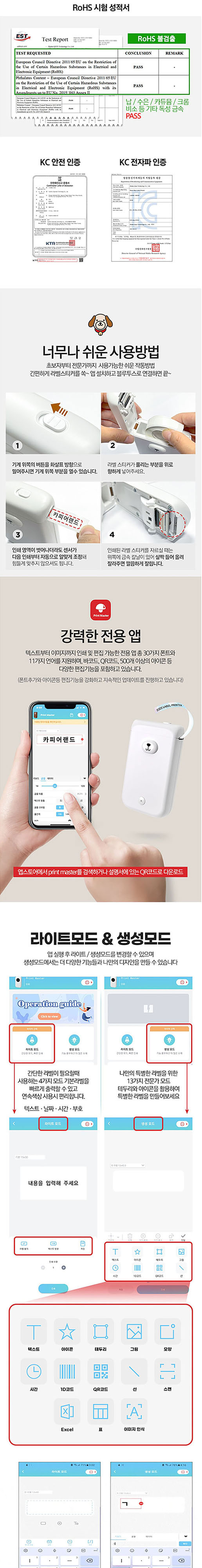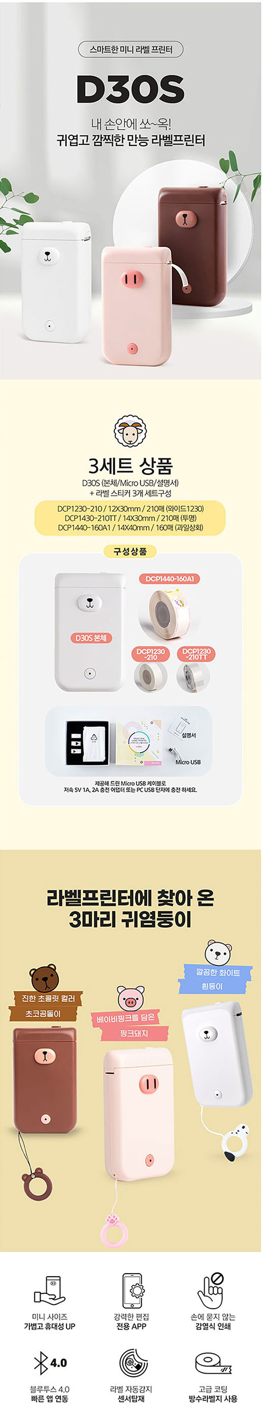 ■ 주요사양 : 구성(라벨프린터 DS30S+라벨프리트지 3SET)소프트웨어(IOS, Android앱지원)해상도(203dpi)블루투스(4.0지원)사용전원(5v-2A)인쇄방식(감열식)충전방식(Micro USB)제품무게(172g)