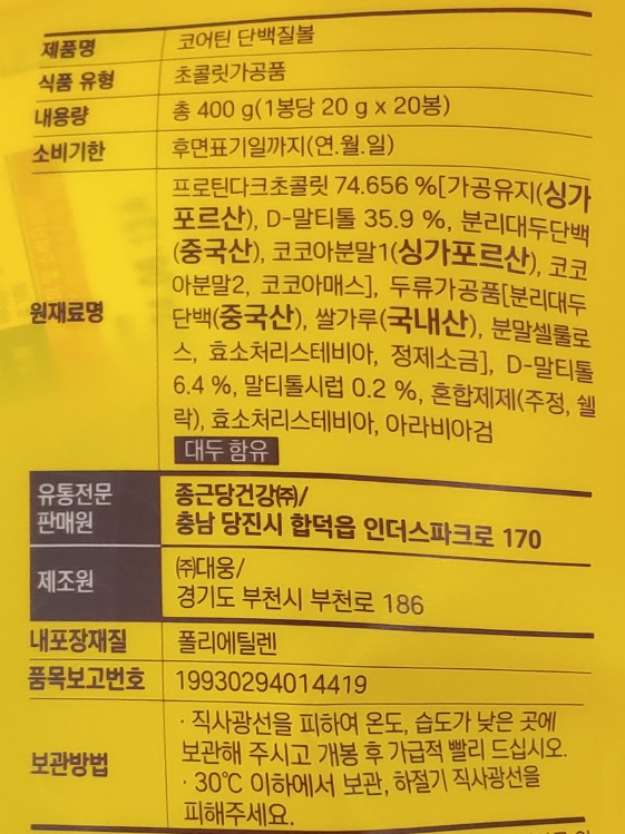 ■ 품명 및 모델명 : 코어틴 프로틴 초콜릿볼 400g(20g*20)