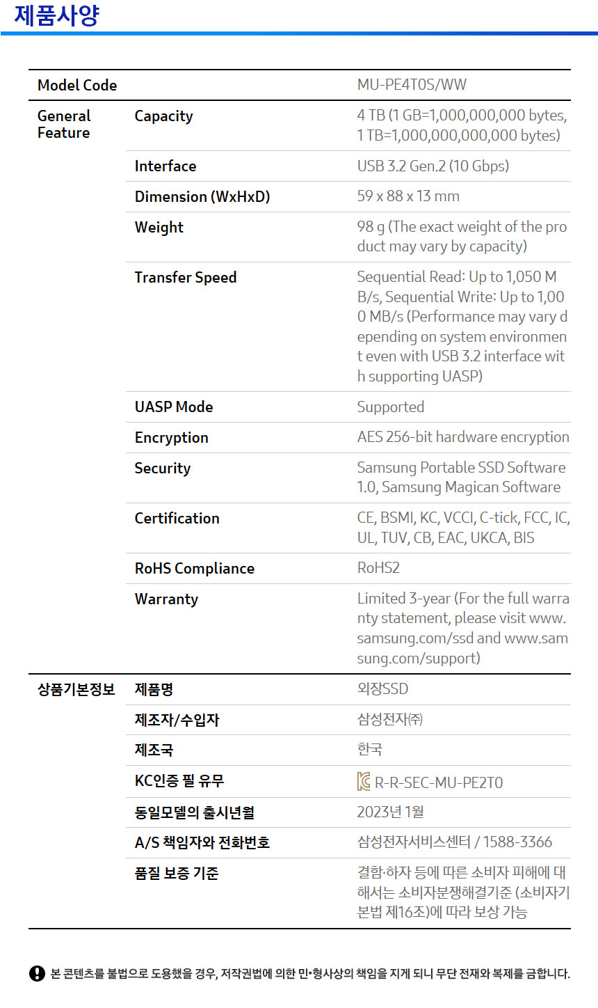 ■ 주요사양 : *인터페이스 USB3.2 Gen(5Gbps),* 읽기 최대 1,050MB/s, 쓰기 1,000MB/s,* 삼성 Magician 소프트웨어