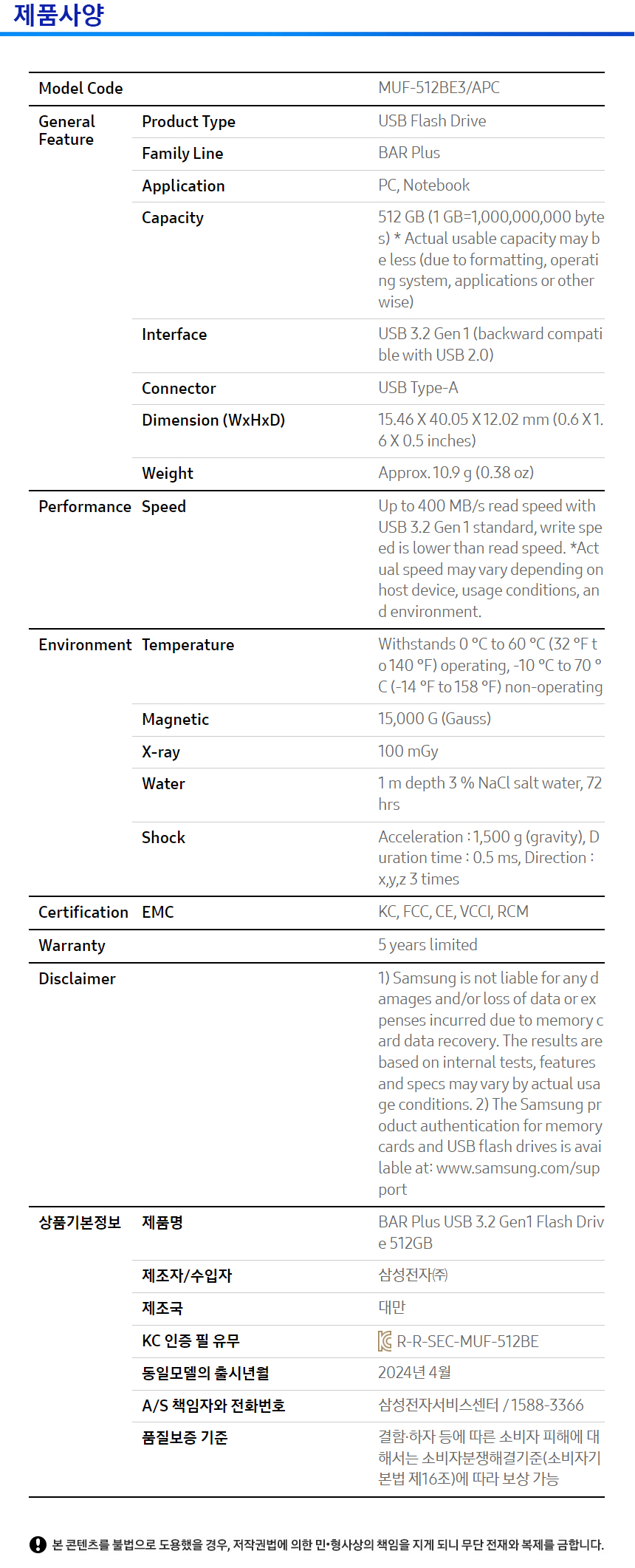■ 품명 및 모델명 : 삼성 BAR PLUS USB(MUF-512BE3/512GB/삼성)